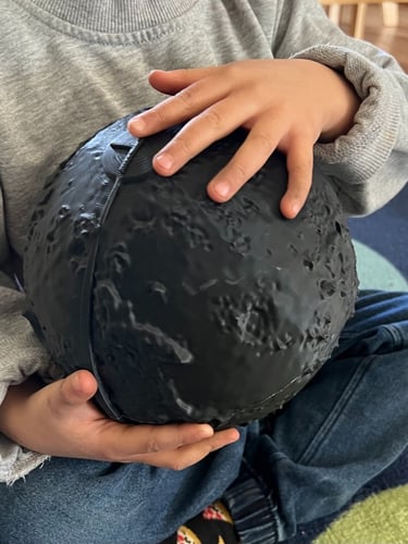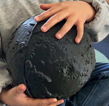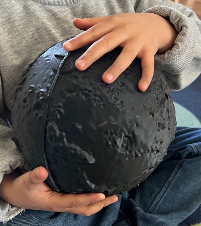 In this activity, we walk with our fingers across the surface of the Moon (and also Mars). We feel its textures, discover its craters, mountains, and even volcanoes. It is a mindful way to explore other worlds, connecting with them through touch. These 3D models were obtained thanks to the A Touch of the Universe project and were printed by Oriol Molgo.